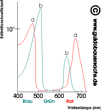 Licht, das von Chlorophyll a nur in geringem Maße absorbiert wird - zum Beispiel bei 460 nm -, wird vom Chlorophyll b eingefangen, das bei dieser Wellenlänge eine intensive Absorption besitzt. Damit ergänzen sich diese zwei Chlorophyllarten bei der Absorption des einfallenden Sonnenlichtes. Das Licht des spektralen Bereichs zwischen 500 und 600 nm (grün) wird von diesen Chlorophyllen nur schwach absorbiert, deswegen erscheinen die Blätter auch grün.