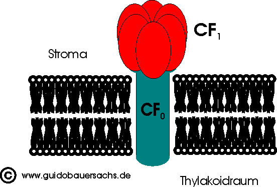 Die CF1-Einheit befindet sich auf der Stromaseite (aussen) der Thylakoidmembran, so dass neusynthetisiertes ATP im Stromaraum freigesetzt wird, auch das vom PS I produzierte NADPH verbleibt hier. Die Produkte der Lichtreaktion der Photosynthese - ATP und NADPH - sind somit an der richtigen Stelle um in die Dunkelreaktion einzugehen.