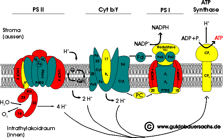 Der Elektronentransfer durch die PS I, Cyt-bf-Komplex und PS II erzeugt einen großen Protonengradienten von der einen zur anderen Seite der Thylakoidmembran.