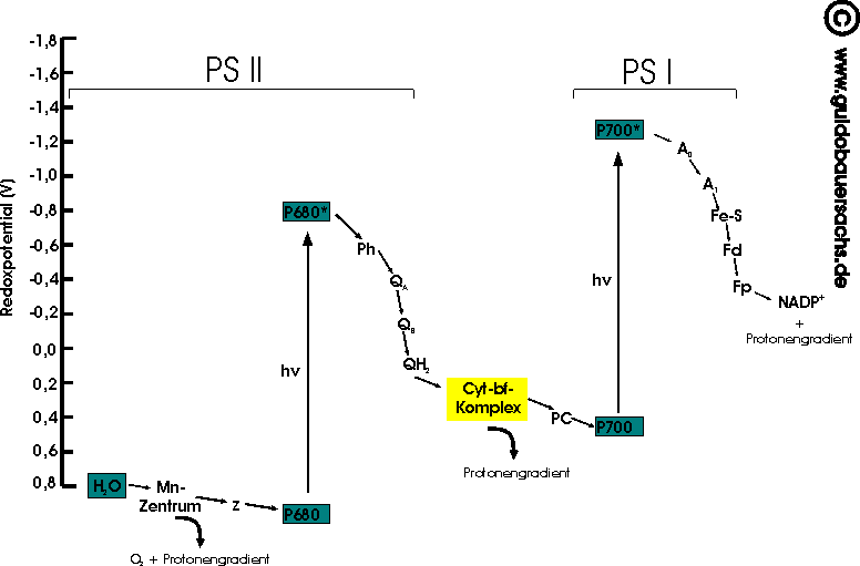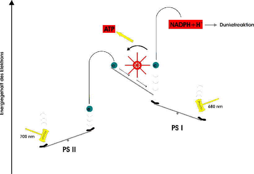 Licht bewirkt einen Elektronenfluß vom Wasser zum NADPH und führt zur Erzeugung eines Protonengradienten. Dieser Weg wird als Z-Schema der Photosynthese bezeichnet, da das Redoxdiagramm von P680 zu P700+ wie ein Z aussieht.