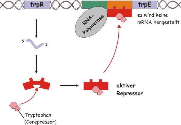 Der Repressor ist ein Polypeptid, welches durch das so genannte Regulatorgen codiert wurde. Das Regulatorgen des Trp-Repressors liegt in einiger Entfernung vom Operon entfernt. Die Transkription des Gens führt zu einer mRNA, die in das Repressorprotein translatiert wird. Der Repressor gelangt dann durch Diffusion zum Trp-Operon.