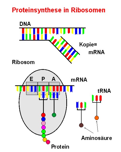 Die Aufgabe der beiden UE's besteht in der Verknüpfung der einzelnen Aminosäuren, die mit Hilfe der m-RNA in der richtigen Reihenfolge zusammengebaut werden und mit der t-RNA heran transportiert werden. Bild