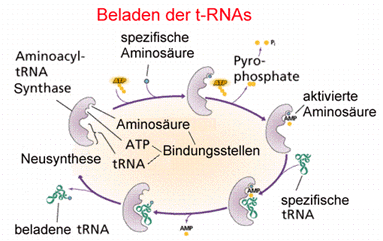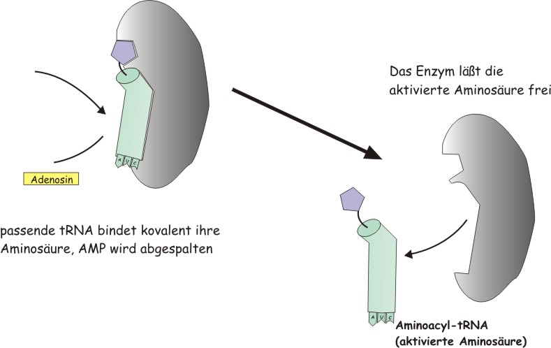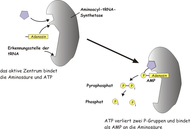 Eine Aminoacyl-tRNA-Synthetase verbindet eine tRNA mit ihrer passenden Aminosäure. Die Bindung einer tRNA an ihre Aminosäure ist eine endergonische Teilreaktion, die unter ATP-Verbrauch abläuft. Das ATP verliert zwei Phosphatgruppen als Pyrophosphat und wird zu AMP.