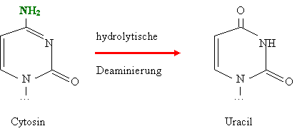 Punktmutationen basieren auf dem Austauch von Basen, der Substitution. Wird eine Pyrimidinbase