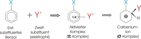 Es gibt Erstsubstituenten (-OH, -CH3, -Halogene), die den Zweitsubstituenten bevorzugt in o- und p- Stellung dirigieren, und Substituenten (-NO2, -CN, -SO3H. -CHO, -COOH), die eine weitere Substitution in m- Stellung begünstigen.