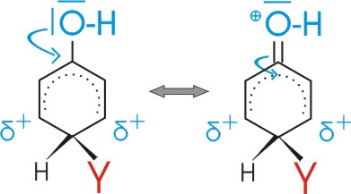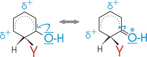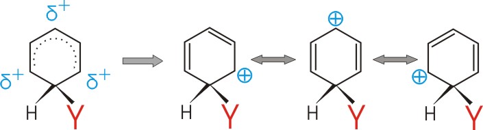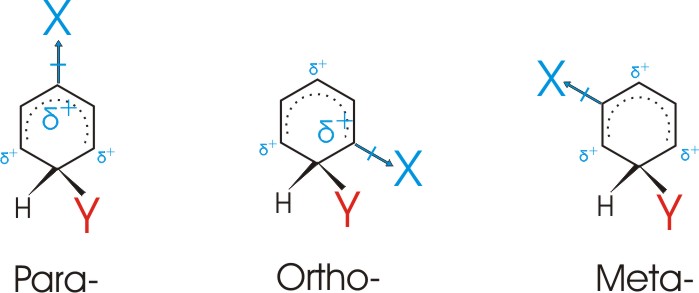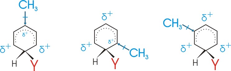 In o- und p- Stellung zum neu eintretenden (Zweit-)Substituenten (Y) treten positive Partialladungen auf.