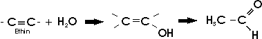 oder durch Addition von Wasser an Ethin unter der katalytischen Wirkung von Quecksilbersulfat (über Vinylalkohol, der durch intramolekulare Umlagerung in das Ethanal übergeht) hergestellt: